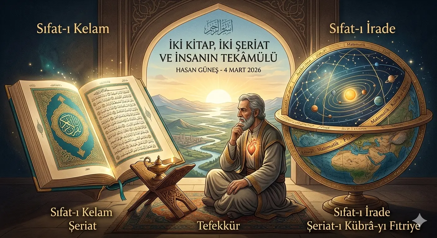 Bediüzzaman Hazretleri, Kur’ân ve kâinatı birbirini tamamlayan iki mukaddes kitap olarak tarif eder. Biri Cenab-ı Hakk’ın “sıfat-ı kelam”ından gelen ve lisanla okunan Kur’ân; diğeri ise O’nun “sıfat-ı irade”sinden gelen, kudret kalemiyle yazılmış cismanî kâinat kitabıdır. Bediüzzaman, bu hakikati “İki Şeriat” kavramı üzerinden şöyle tasnif eder: